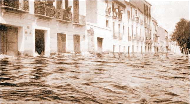 El Pasillo de Santa Isabel de Málaga quedó totalmente anegado tras el paso del agua torrencial que portaba el río Guadalmedina en 1907 |